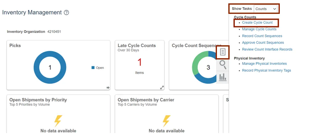 Step 4. Click the Tasks icon. Click the Show Tasks drop-down choice list, then select Counts and click Create Cycle Count.