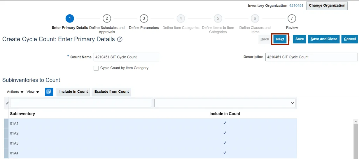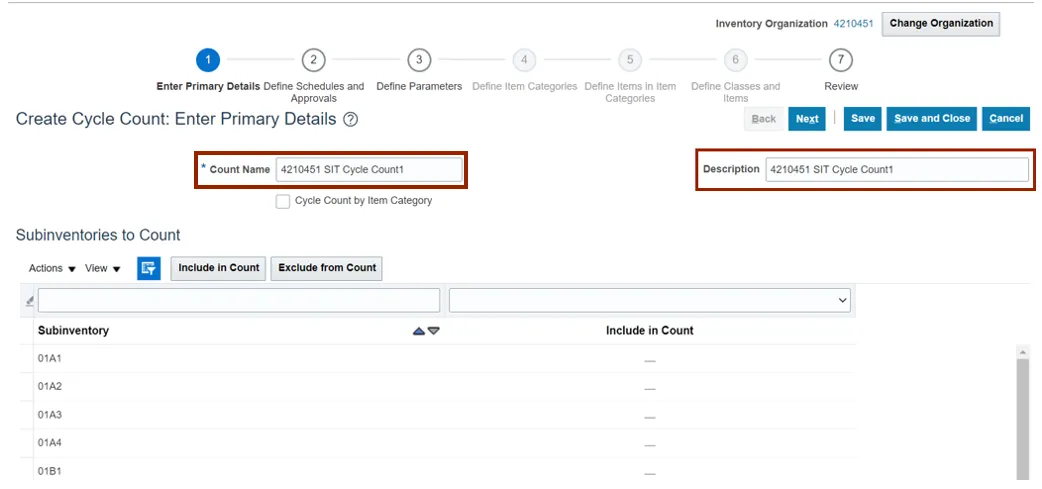 In this example, we choose 4210451 SIT Cycle Count1. Enter the Description as required. In this example, we entered 4210451 SIT Cycle Count1.