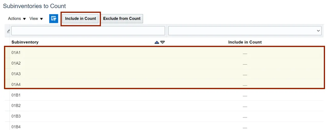 Step 6. You can select a Subinventory. Either you can add them one by one, or you can hold the CTRL key and select multiple Subinventories, and then click the Include in Count button.