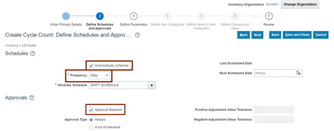 Step 9. In the Schedules section, select the Automatically schedule check box. Click the Frequency drop-down choice list, then select Daily. In the Approvals section, select the Approval Required check box.