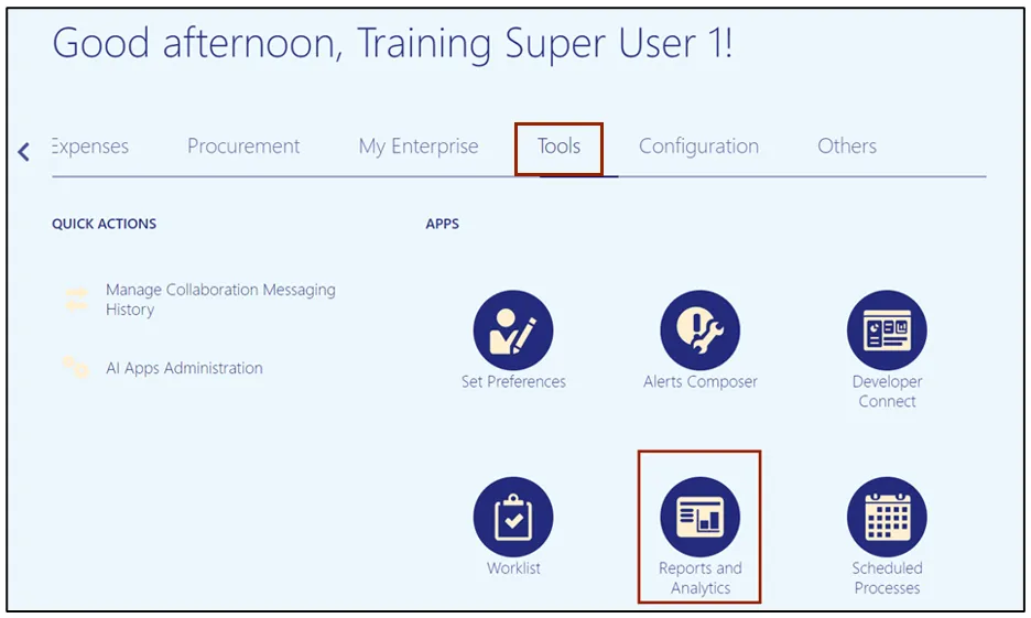 Step 2. On the Home page, under the Tools tab, click the Reports and Analytics app.