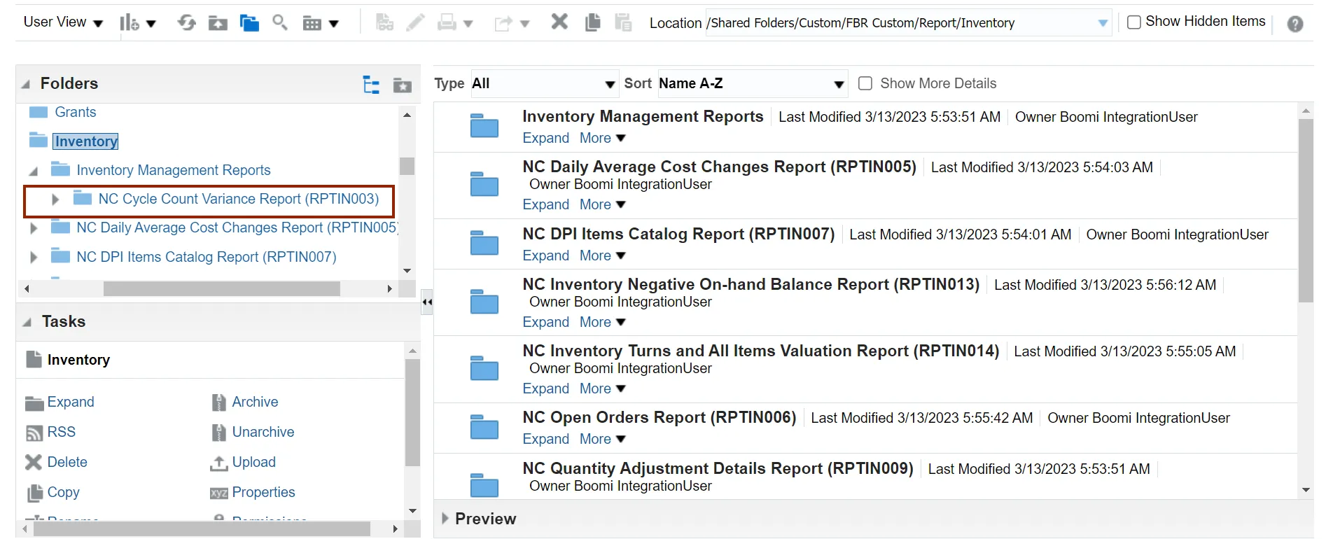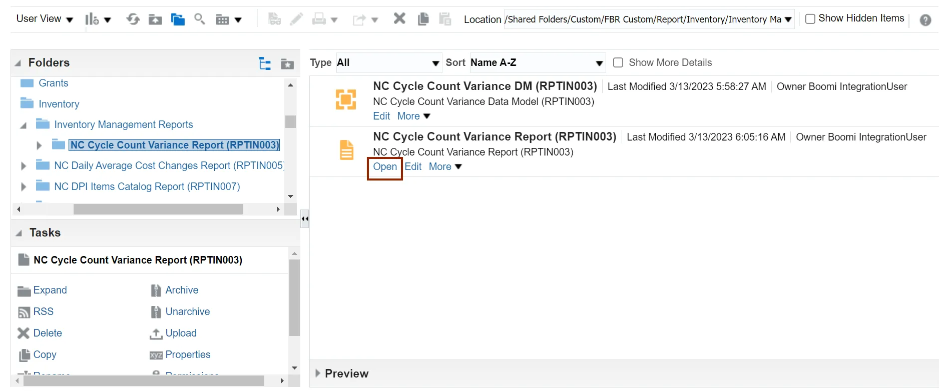 Step 10. Click the NC Cycle Count Variance Report (RPTIN003) folder.