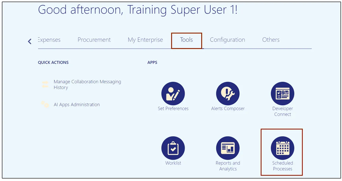 Step 2.    On the Home page, under the Tools tab, click the Scheduled Processes app.