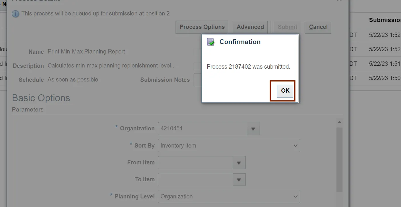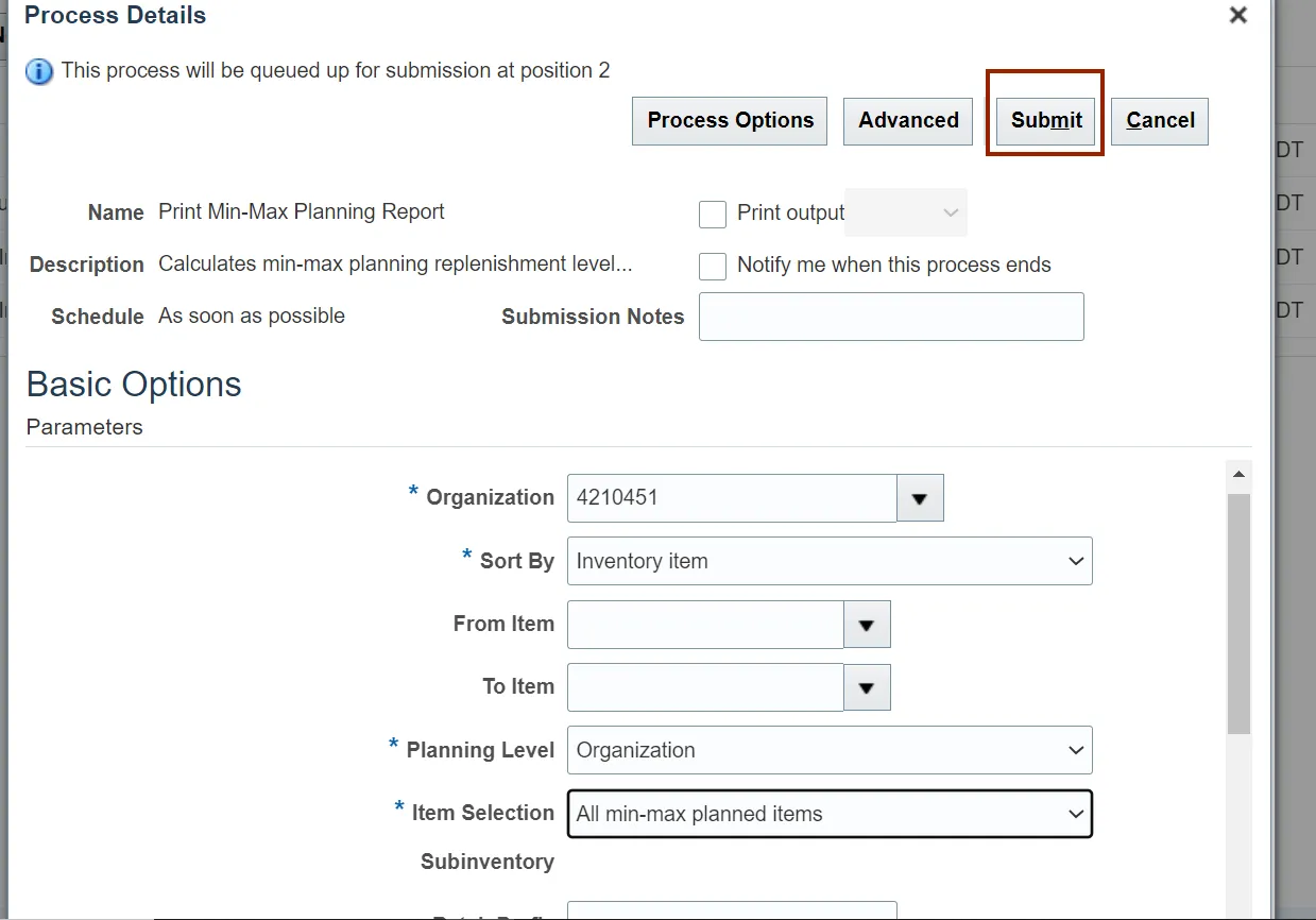 Step 8.    The Process Details pop-up appears. Enter the required parameters such as Organization, Sort By, Planning Level, Item Selection.