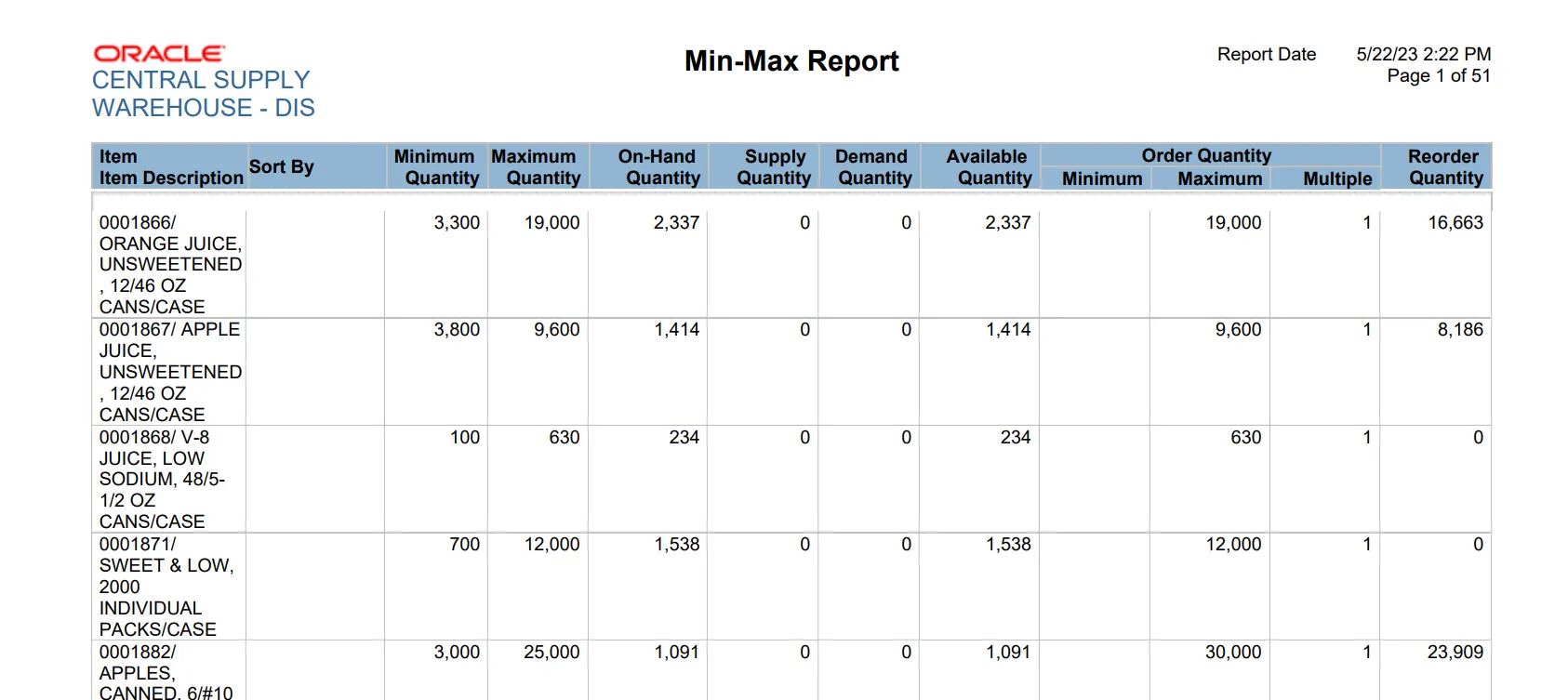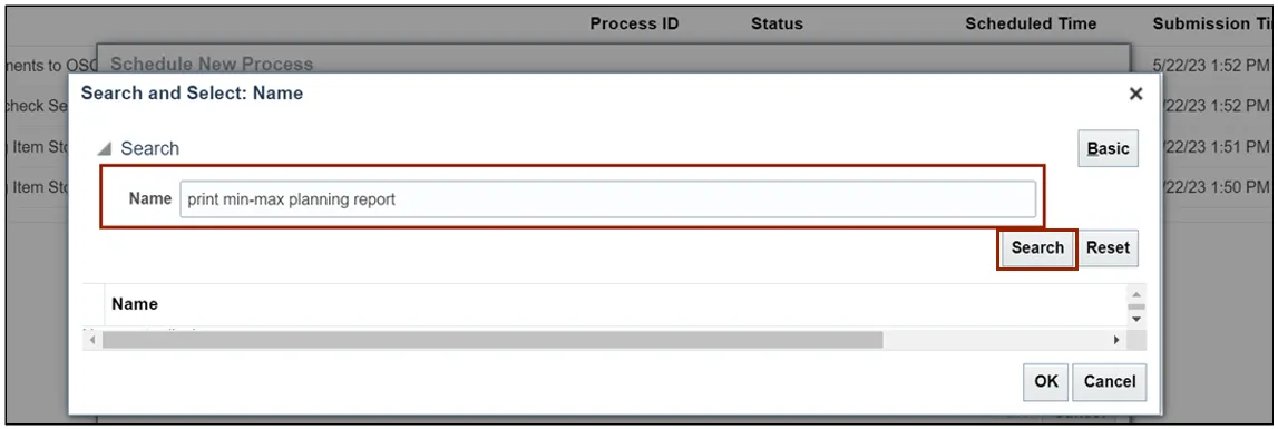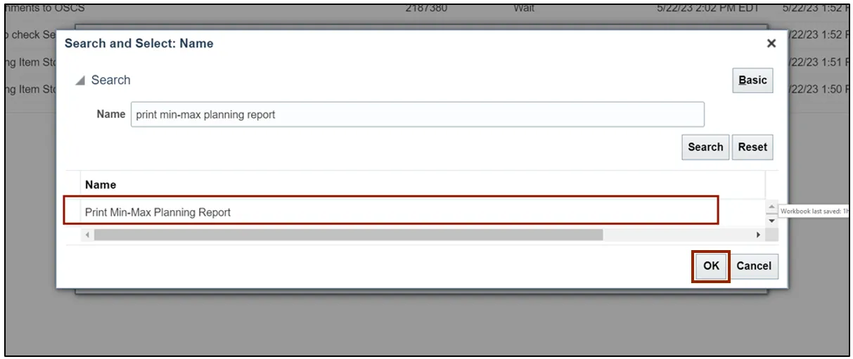 Step 7.    From the search results, click the Print Min-Max Planning Report option. Click the OK button.