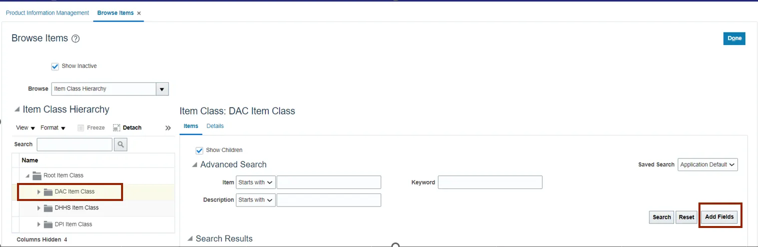 Step 4.    Select the DAC Item Class under the Name section and click the Add Fields button.