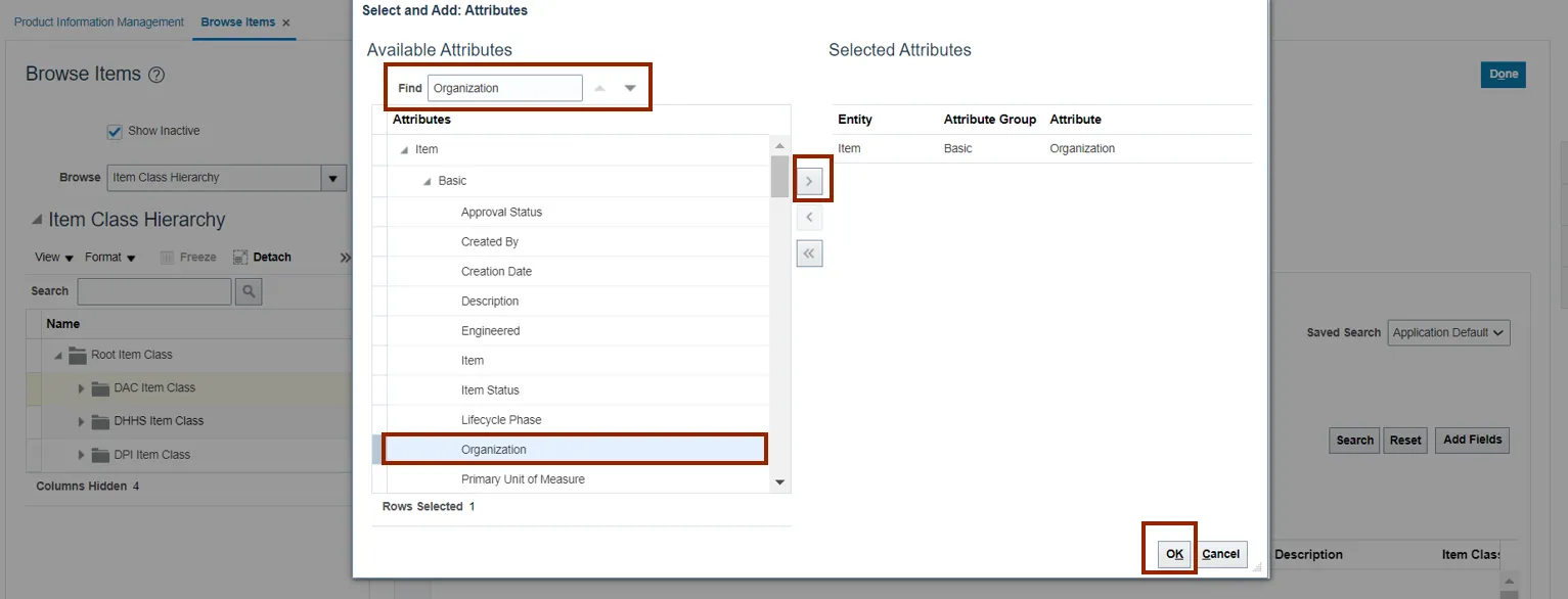 Step 5.    Find the Organization attributes, click the Arrow icon, then click the OK button.