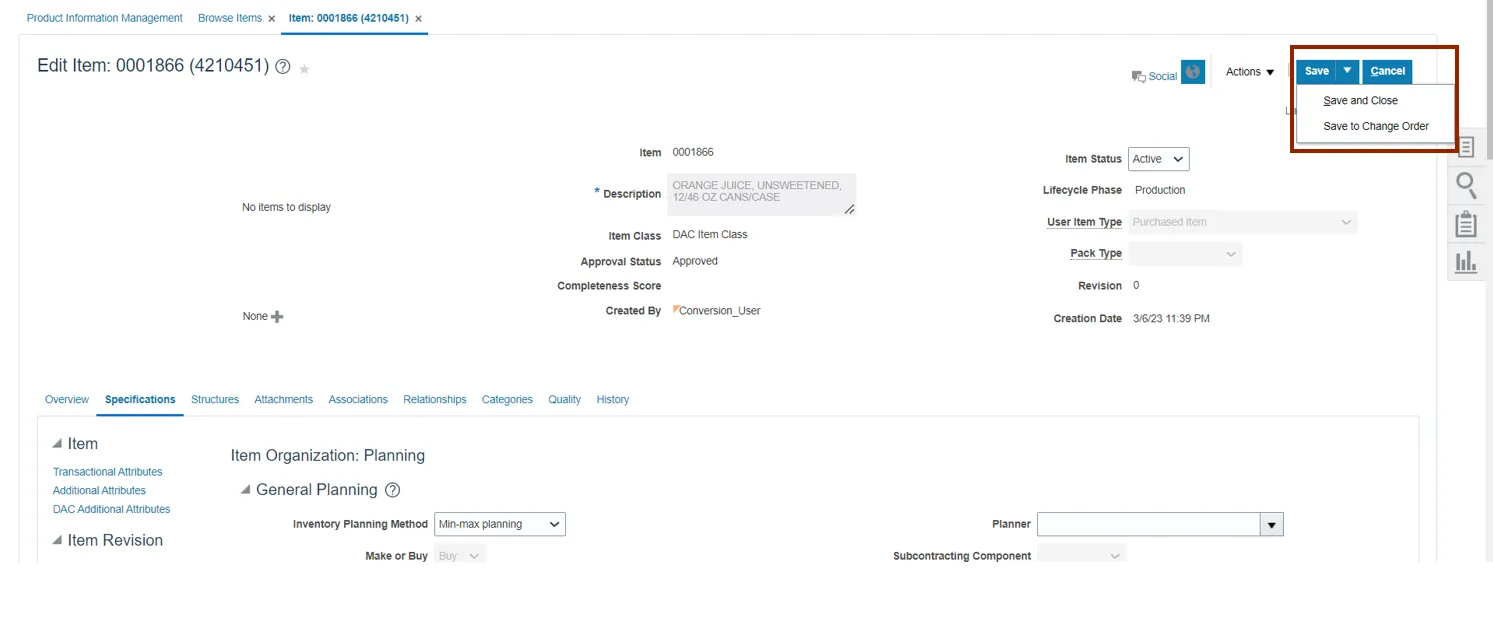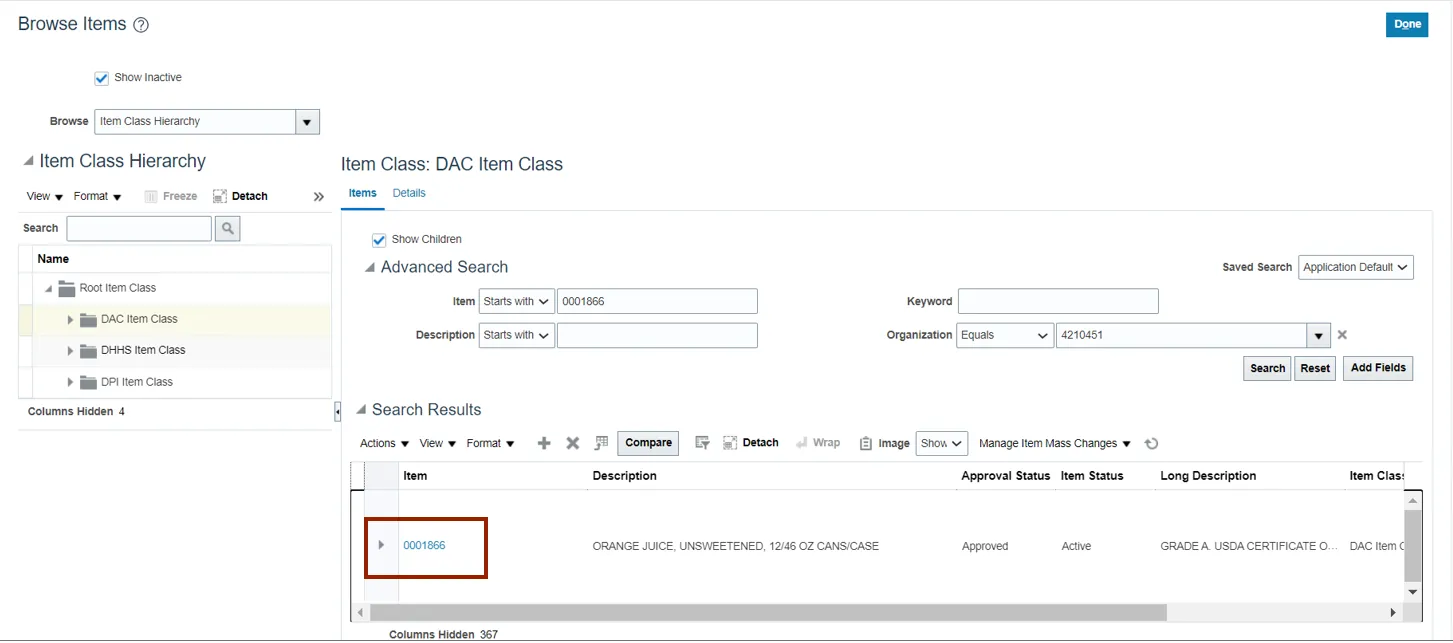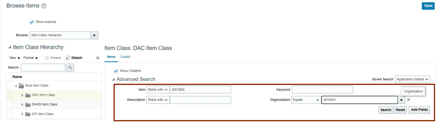Step 6.    Enter the parameters: Items and Organization. In this example, we choose Item 0001866 and Organization 4210451, and click the Search button.