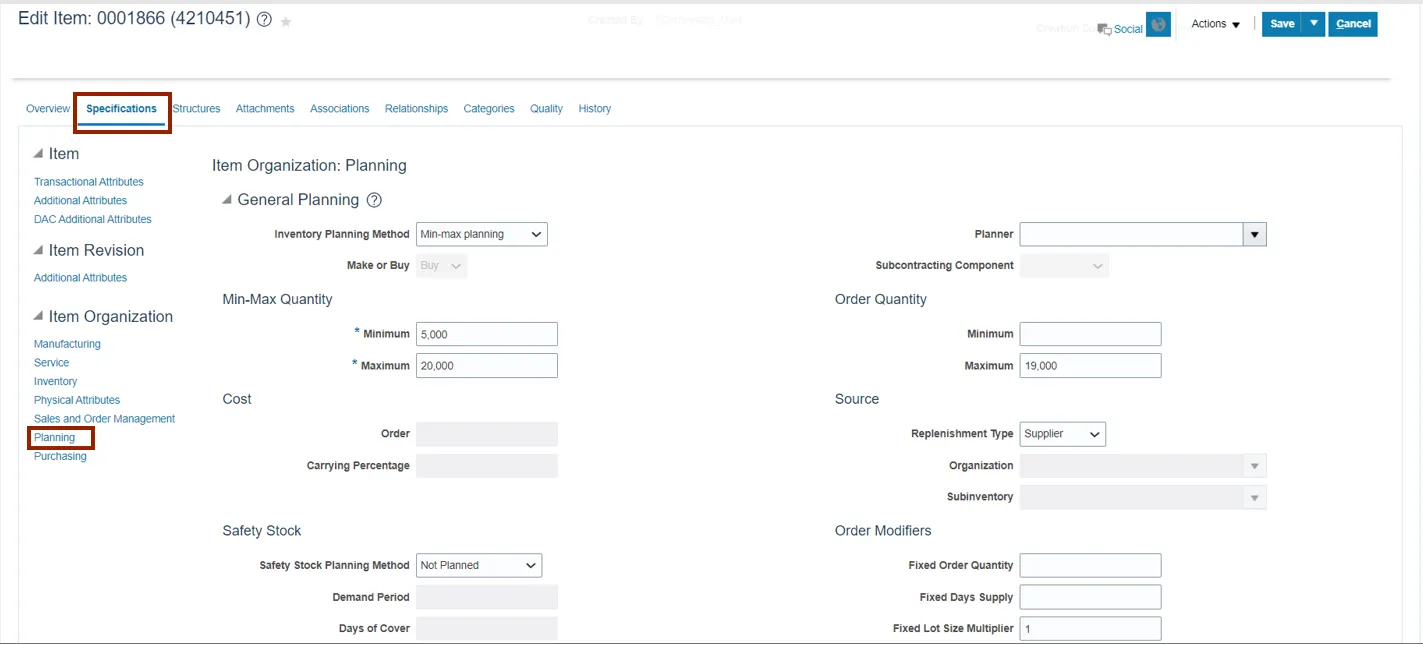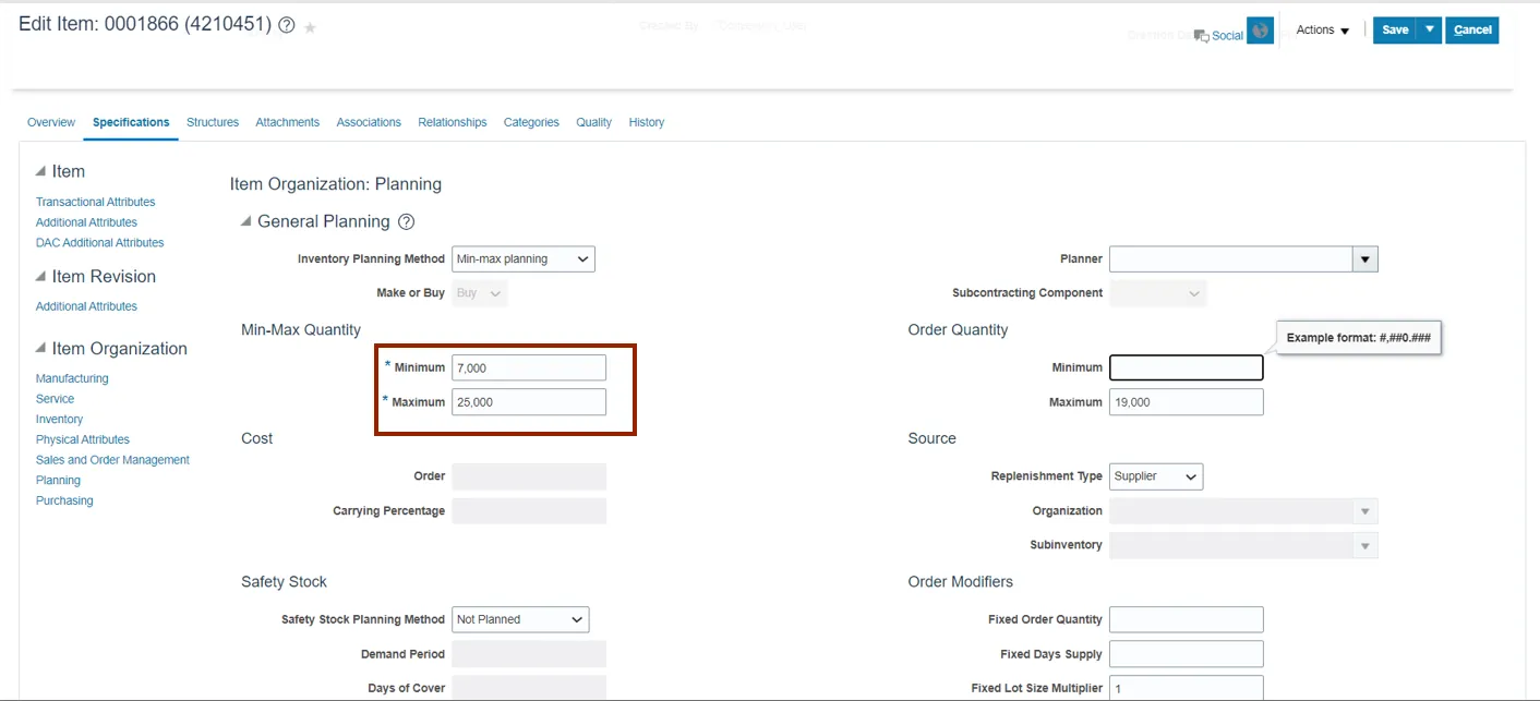 Step 9.    Under the Min-Max Quantity, update the Minimum and Maximum.