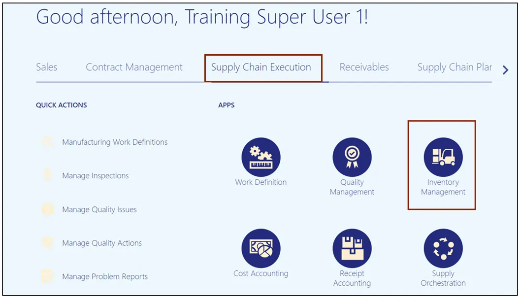 Step 2. On the Home page, under the Supply Chain Execution tab, click the Inventory Management app.