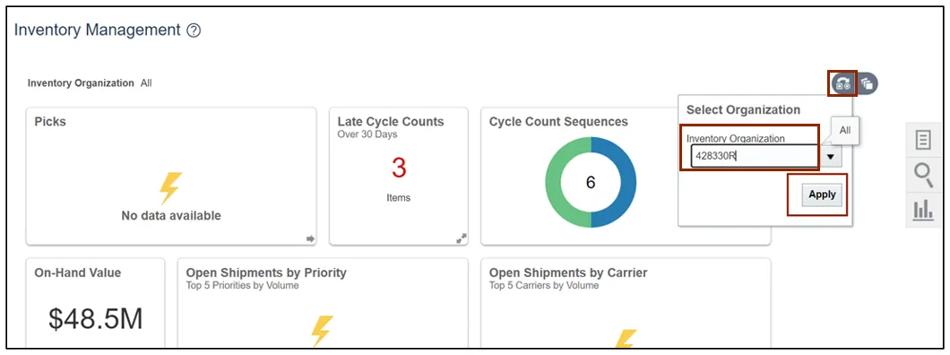Step 3. On the Inventory Management page, click the View by icon and enter the Organization ID. Click the Apply button.