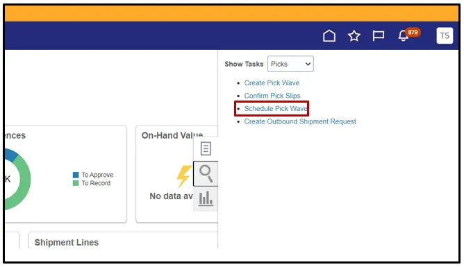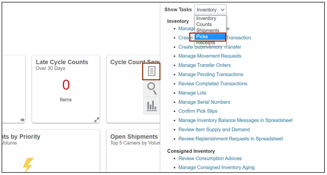 Step 4. Click the Tasks icon and select Picks from the Show Tasks drop-down choice list.