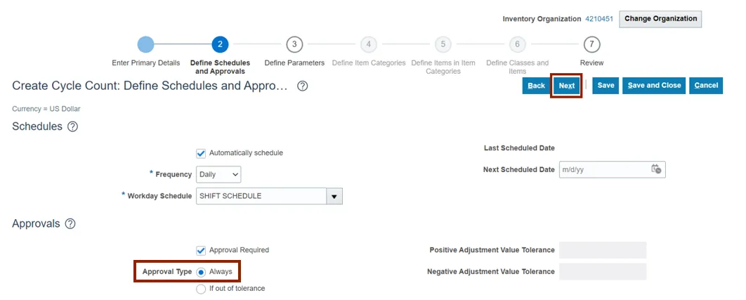 Step 4. Enter the Inventory Organization.