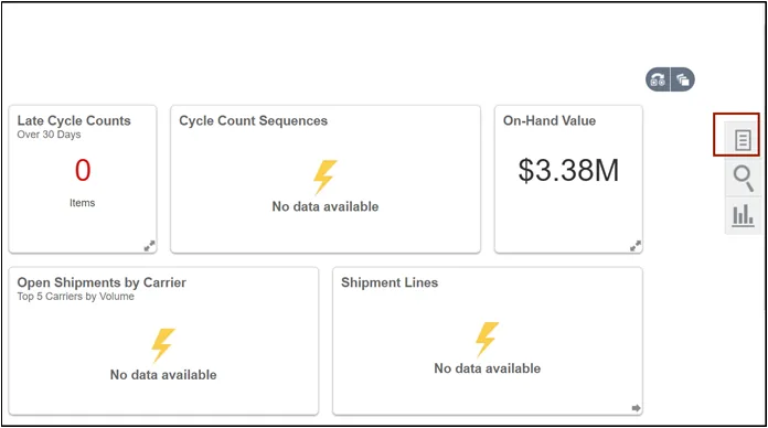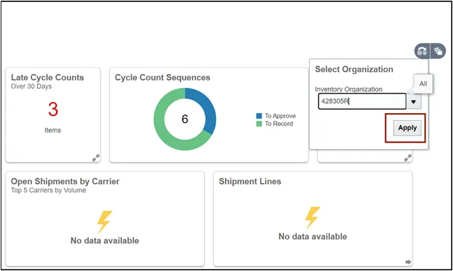 Step 2. On the Inventory Management dashboard, click the View by icon. Click the Inventory Organization drop-down choice list, select the Inventory Organization.
