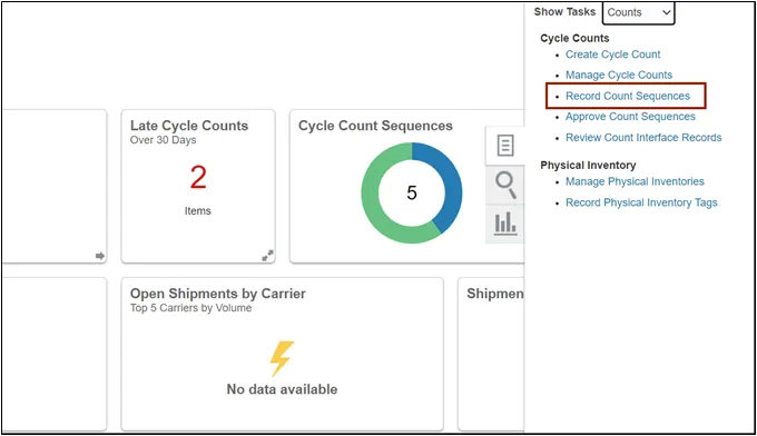 Step 3. Click the Tasks icon. Click the Show Tasks drop-down choice list, then select Counts and click Create Cycle Count.