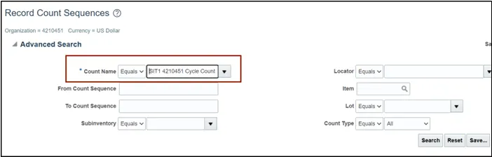Step 9. On the Record Count Sequences page, enter the Count Name in the Advance Search criteria section.