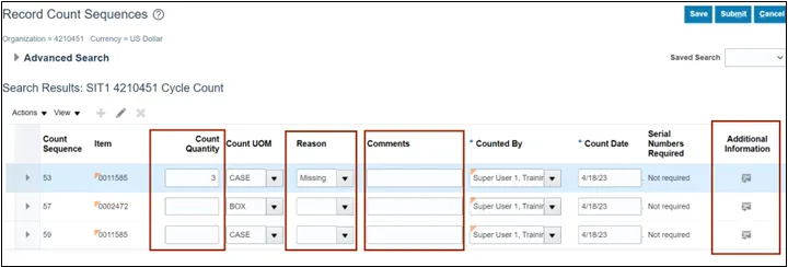 In this example, we entered 4210451 SIT Cycle Count1.