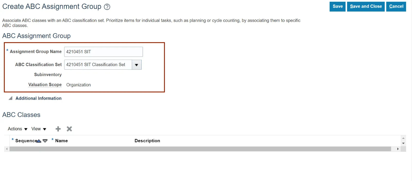 Step 10. Enter the Assignment Group Name and ABC Classification Set.