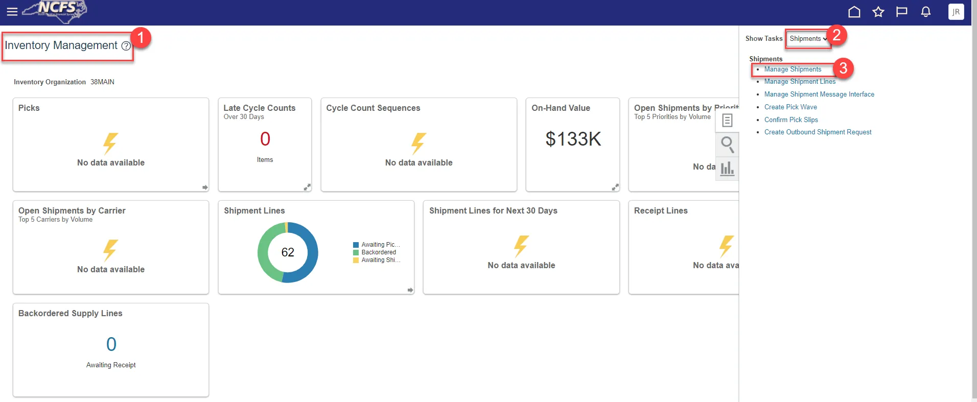 Step 1. Navigate to Inventory Management, under the Task Menu select Shipments and then Manage Shipment Lines.