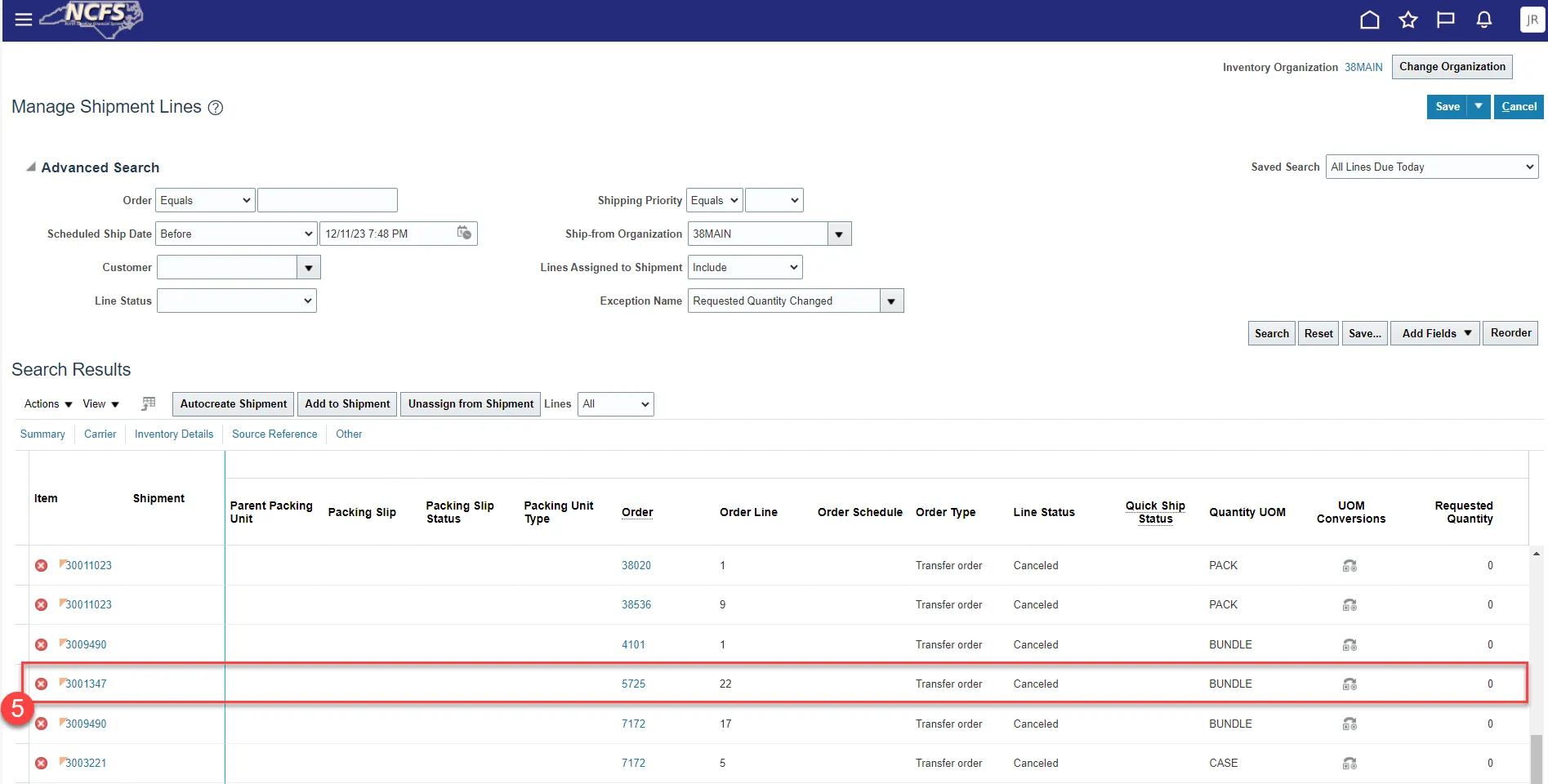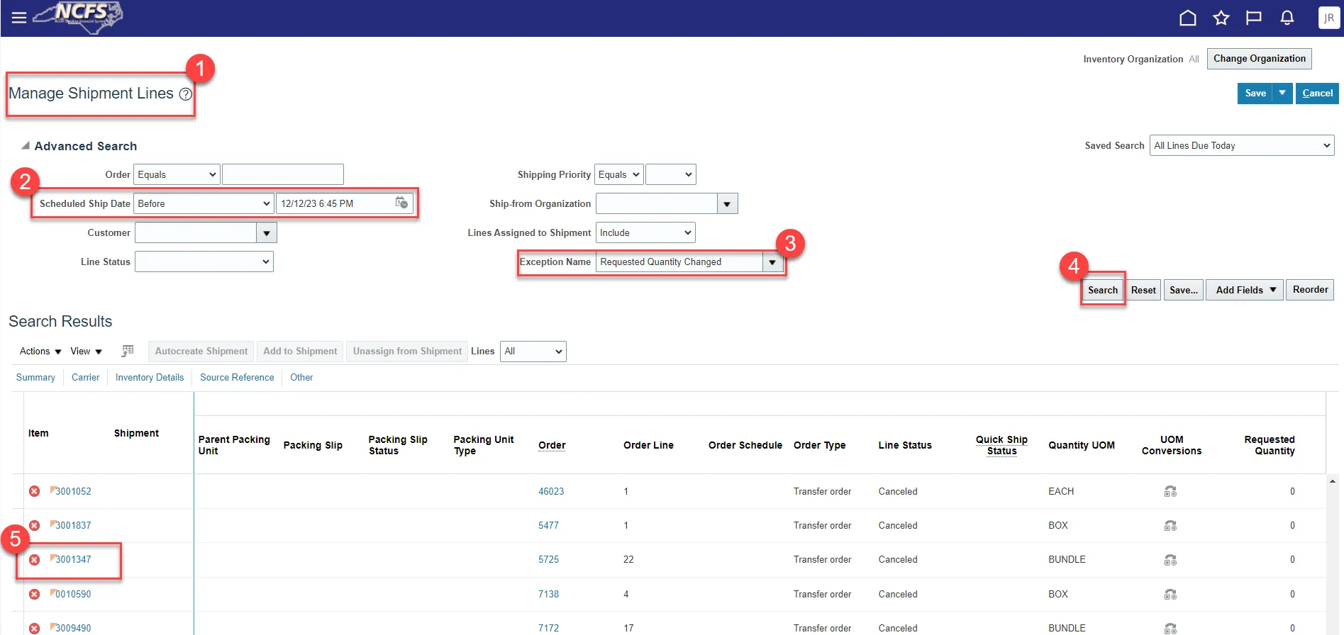 Perform various tasks around Inventory Shipping Exceptions using the steps above in NCFS.
