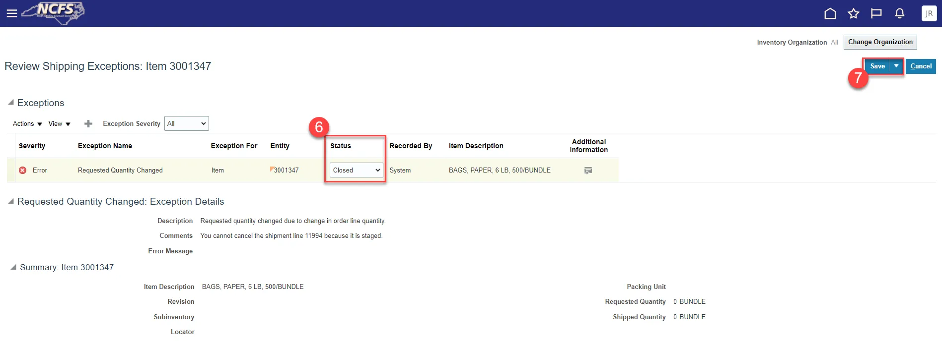 To correct/update inventory shipping exceptions in NCFS, please follow the steps below. There are 7 steps to complete this process.