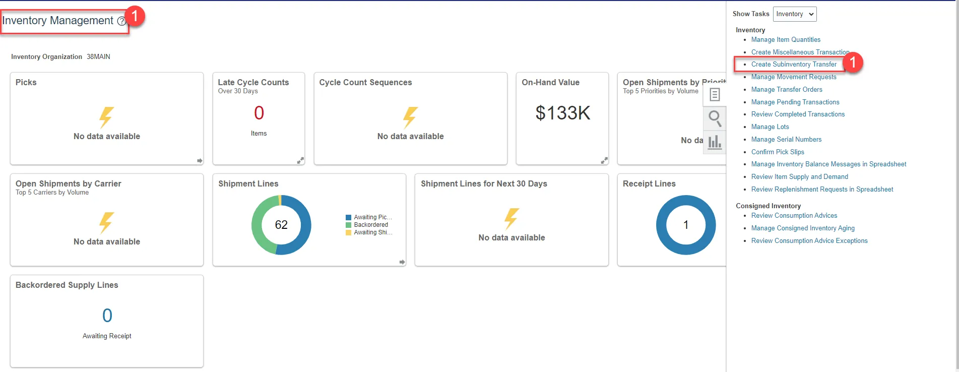 Step 1. Navigate to Inventory Management and select Create Subinventory Transfer from the Tasks menu.