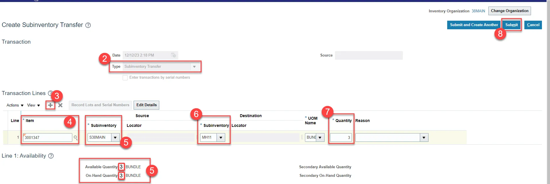 Step 5. Enter the Staging Area in the Source Subinventory Area field. The Available and On-Hand Quantity’s should have enough quantity for the transfer.