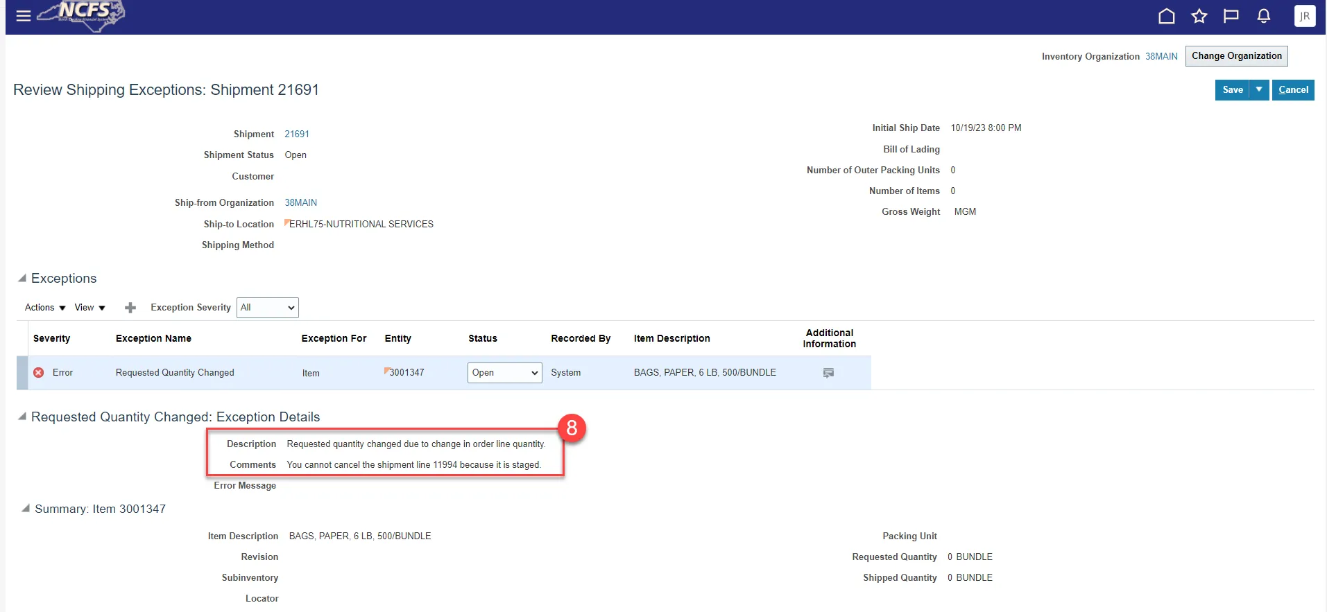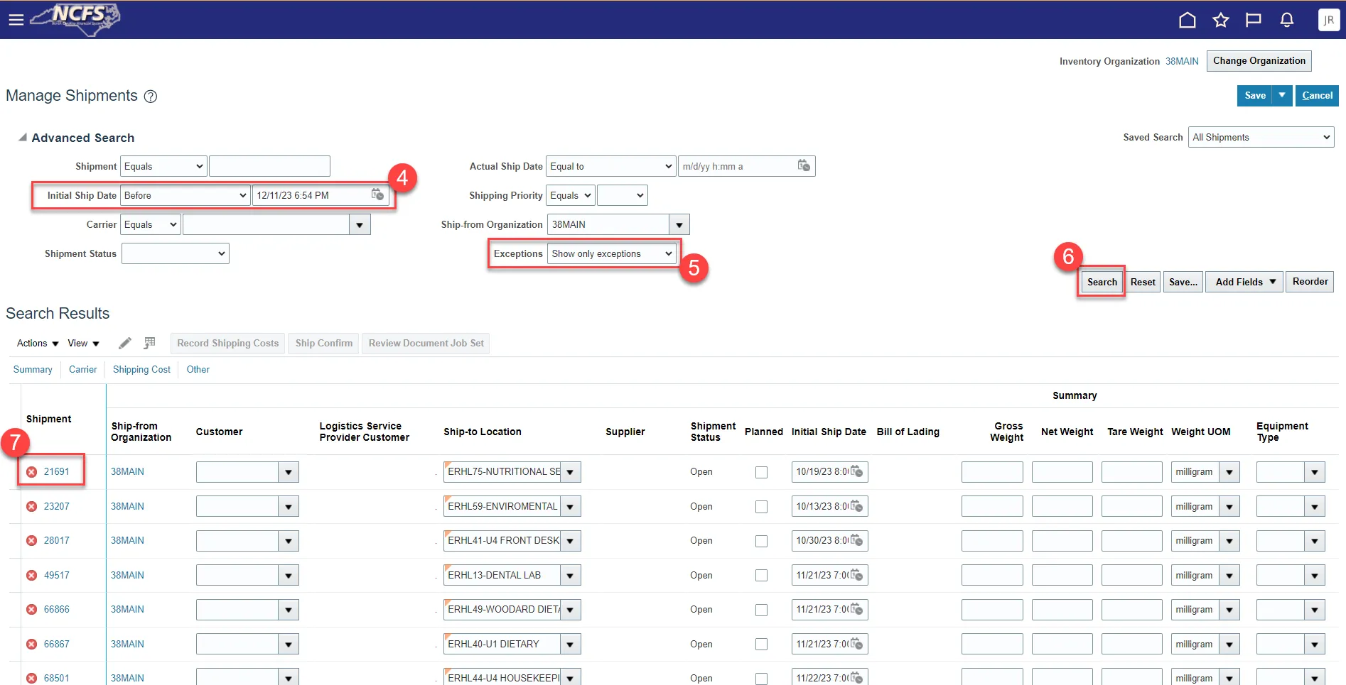 To review inventory shipping exceptions in NCFS, please follow the steps below. There are 8 steps to complete this process.