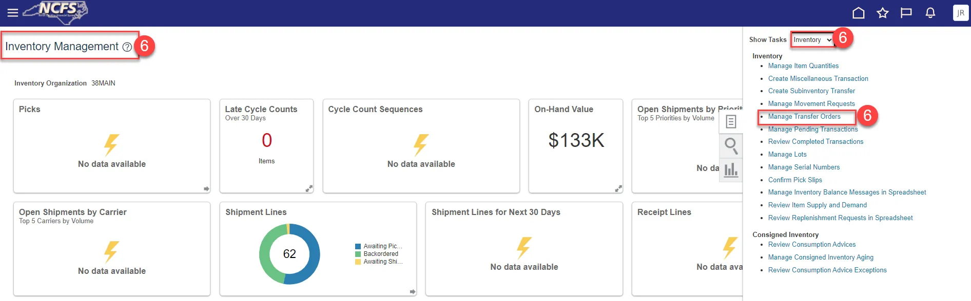 Step 6. Navigate back to Inventory Management, under the Tasks menu select Inventory and then Manage Transfer Orders.