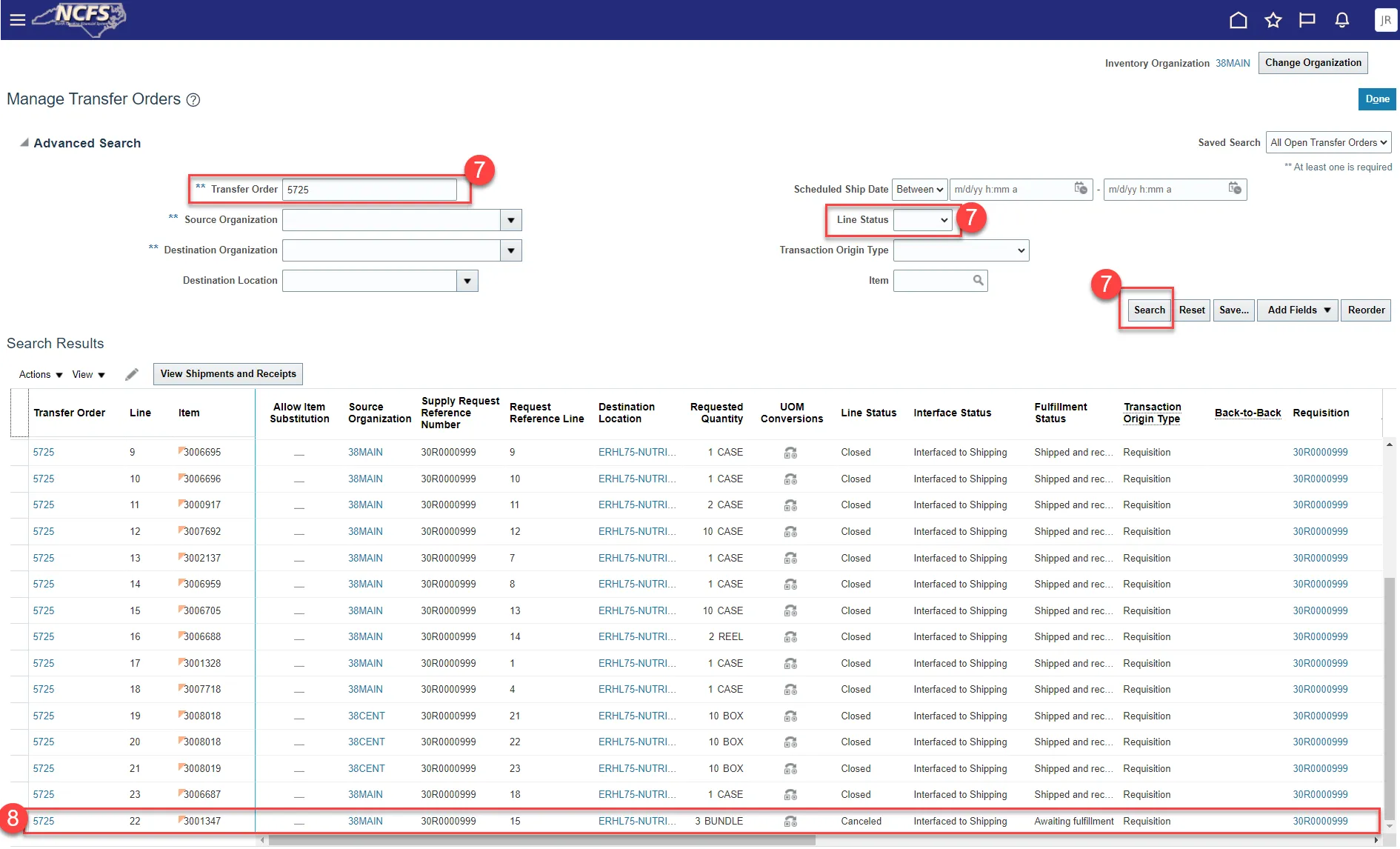 To locate and research the transfer order number related to shipments and exceptions in NCFS, please follow the steps below. There are 9 steps to complete this process.