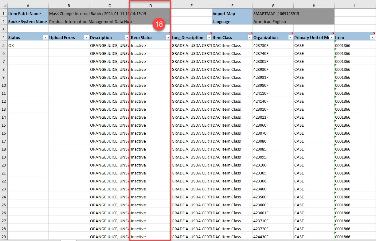 Step 18. Update the status to Inactive or Active in column D for each row desired for status updating.