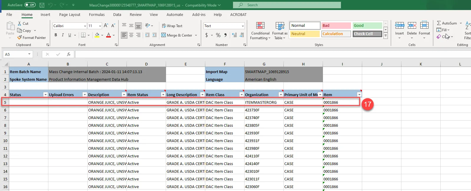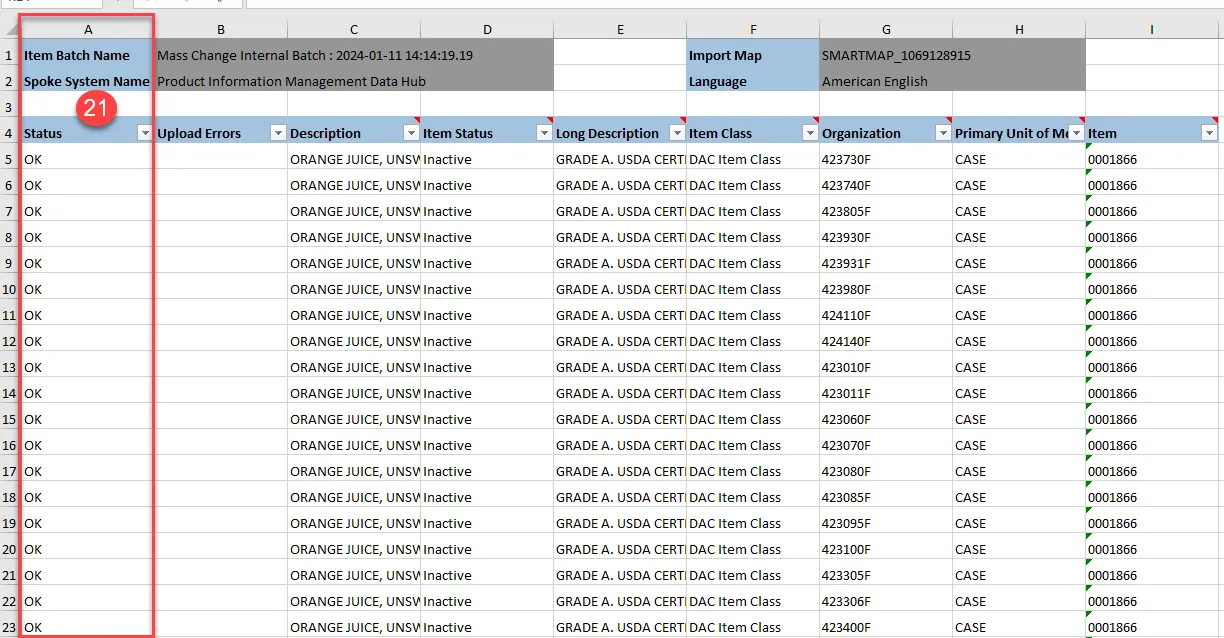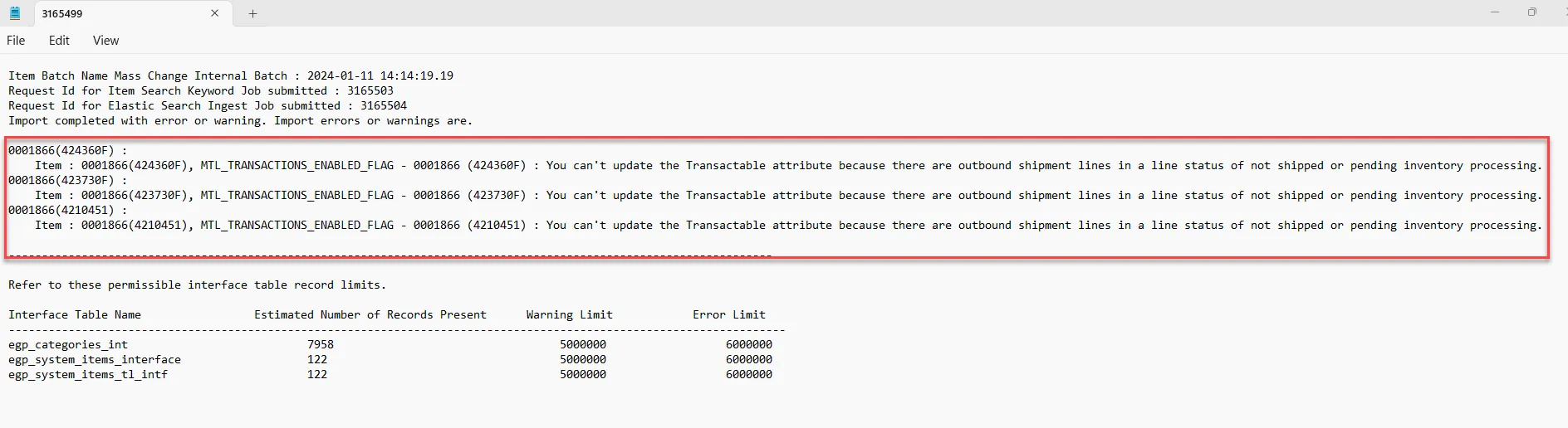 Step 40. Error details will be displayed in the file. The error messages will inform you which warehouse(s) the item was not updated for due to pending inventory processing.