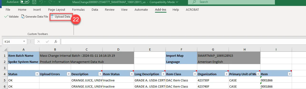 Step 22. Click Upload Data under Add-ins in Excel.