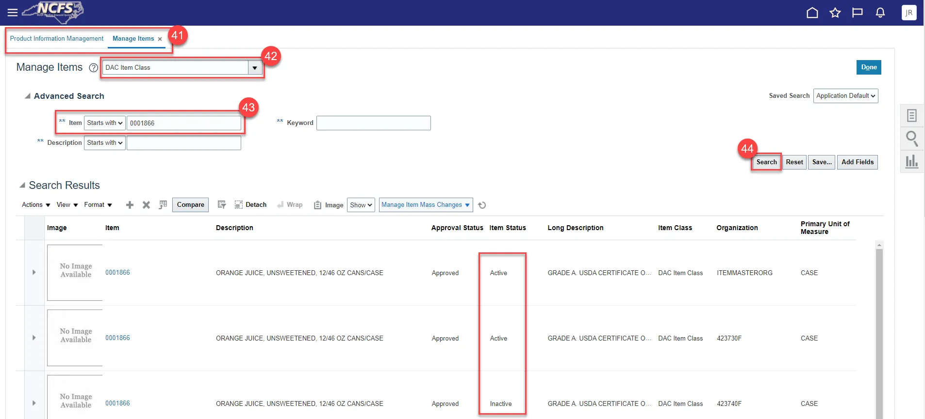 - NCFS will allow an item to be made inactive even if there is an on-hand quantity existing. The only way to remove the on-hand quantity on an inactive item(s) is by reactivating the items at the Master Org level first and then at the Org level.