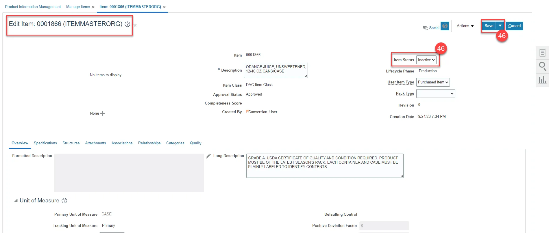 Step 46. The last step, once all item Organizations are inactive, is to make the ITEMMASTERORG inactive. Update Item Status to Inactive and click Save.