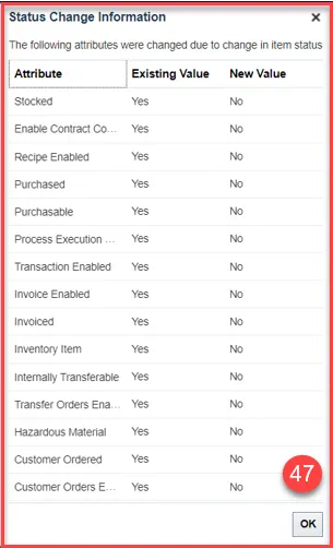 Step 45. The below item attributes will update to No when an item status is made inactive from active for Inventory Organizations.