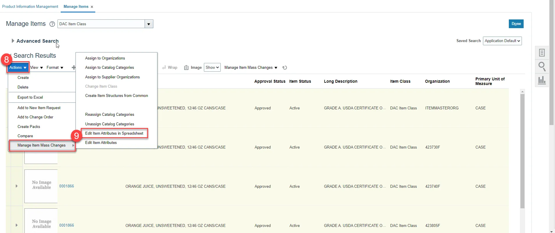 Step 9. Select Manage Item Mass Changes and then select Edit Item Attributes in Spreadsheet.