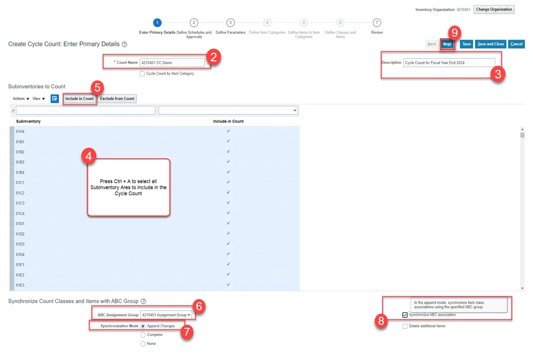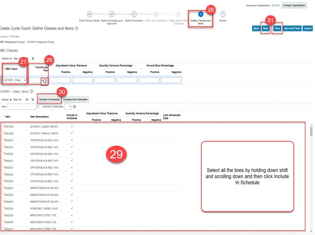 Step 29. Select all the Items to be included in the Cycle Count.