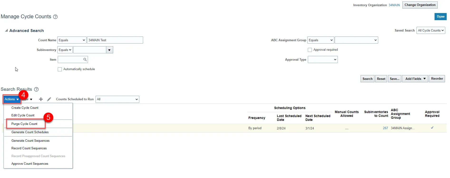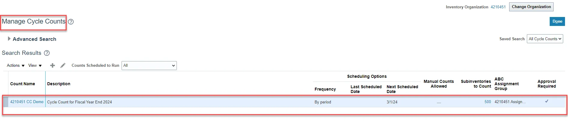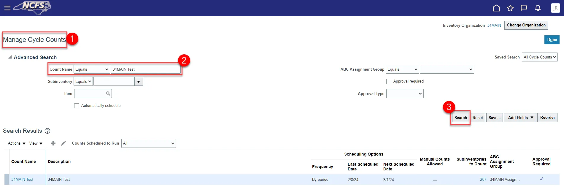 Step 11. Navigate back to the Manage Cycle Counts and search for the cancelled cycle count name.