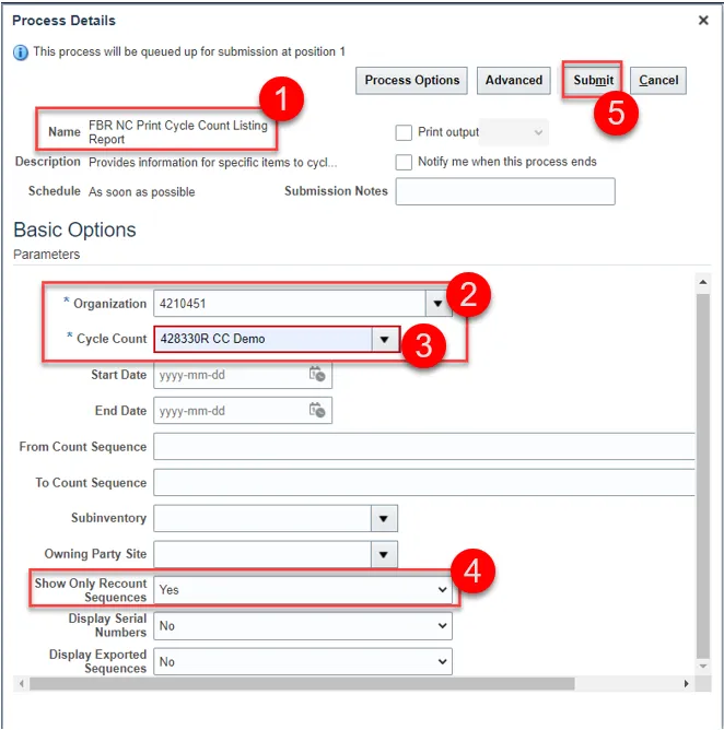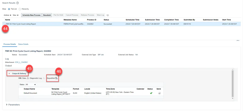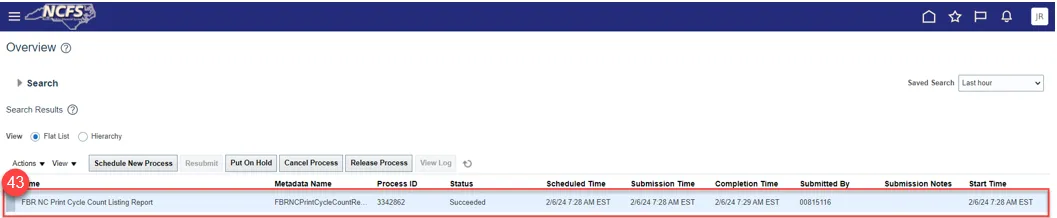 Step 39. Next, run the FBR NC Print Cycle Count Listing Report in Scheduled Processes.