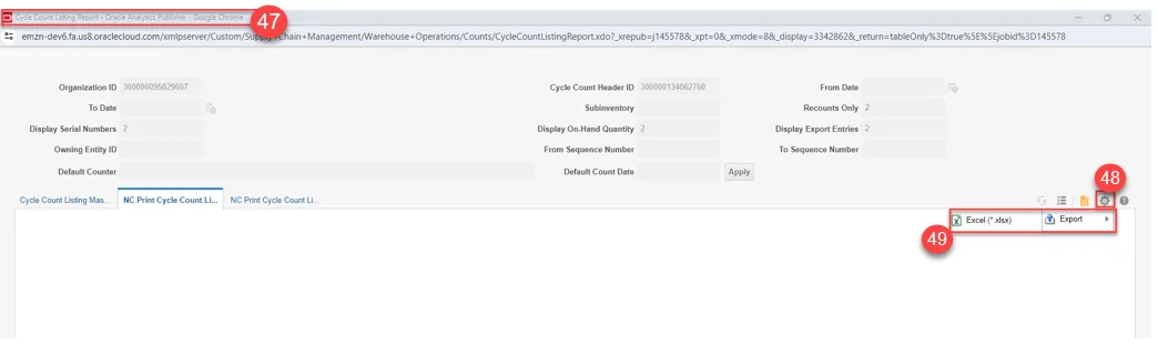 Step 47. The Cycle Count Listing Report window will open.