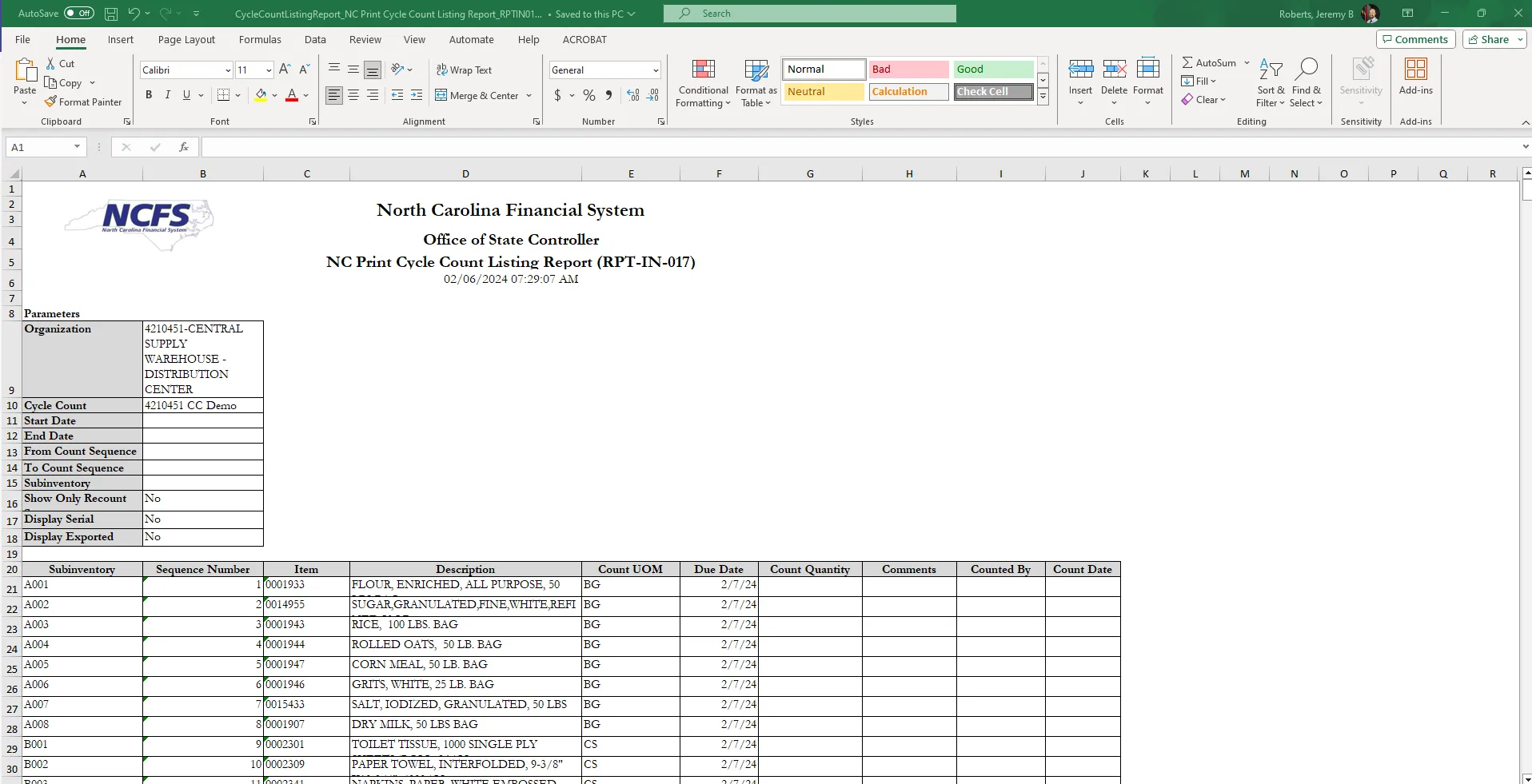 This QRG covers how to and manage Inventory ABC classes, Assignment groups, and Classification Sets for the entire Warehouse Organization, Create a Cycle Count, Record Cycle Count Sequences, Approve Cycle Count Sequences, Review Inventory Item Quantity Updates, Recount Inventory Items from the Cycle Count, Cancel a Cycle Count and Review the NC Cycle Count Variance Report (RPT-IN-003) in NCFS.