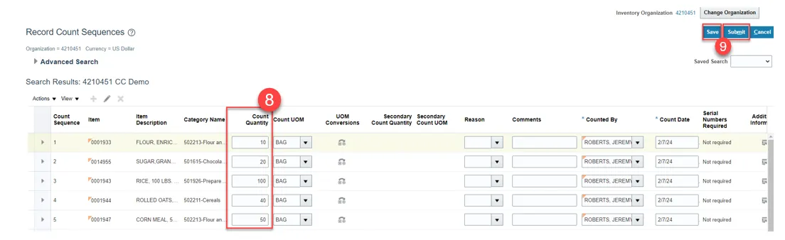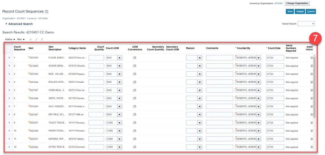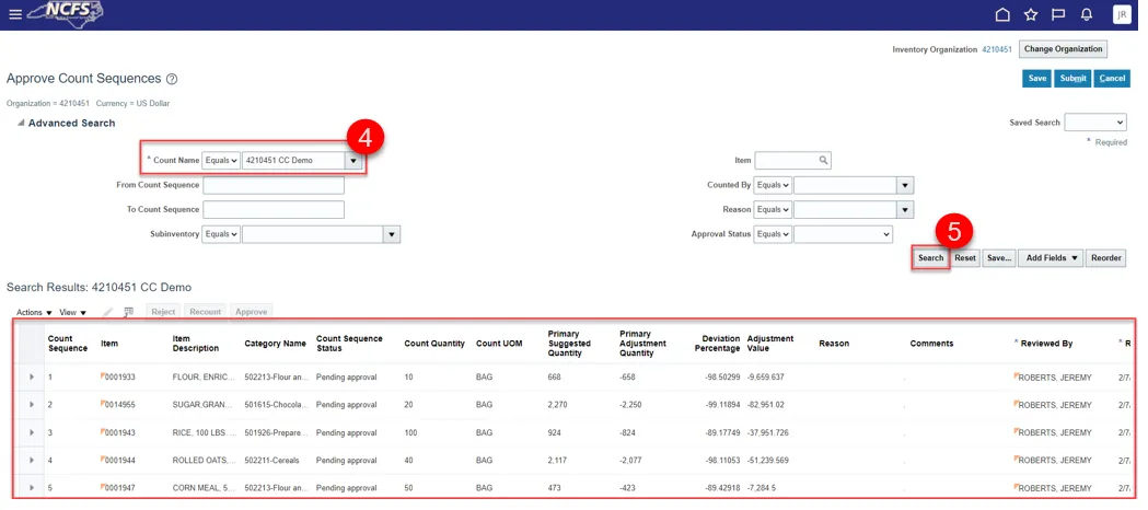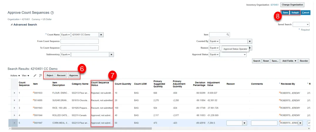Step 7. Review the item quantity for approved cycle count sequence status.