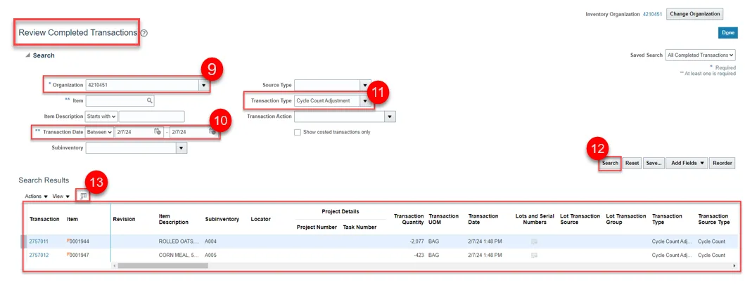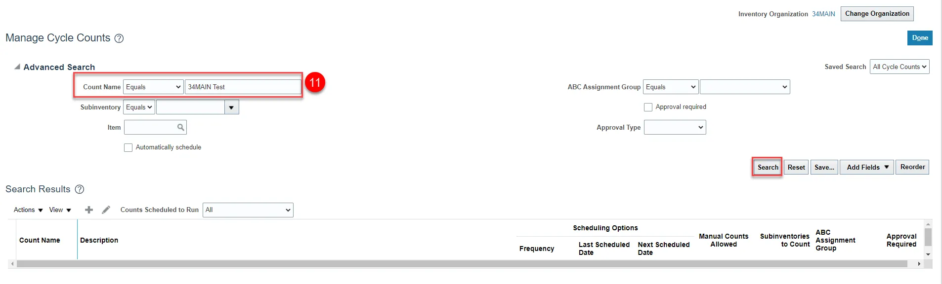 Step 5. Enter the Organization number in the Organization field the cycle count was performed for.