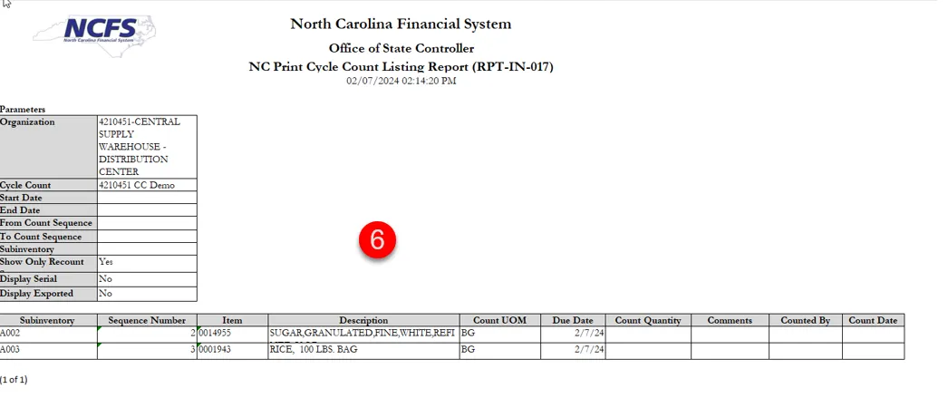 Step 1. Warehouse physically counts the warehouse inventory item counts and records them on the NC Print Cycle Count Listing Report sheets.