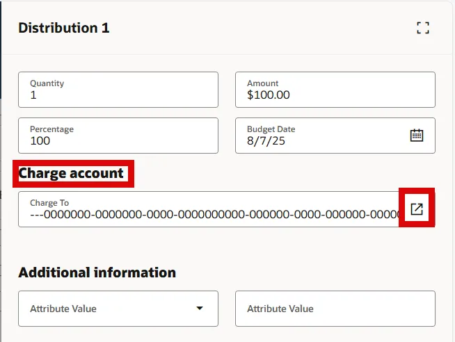 Step 19. In the Charge Account section, select the Box with arrow in the Charge To field.