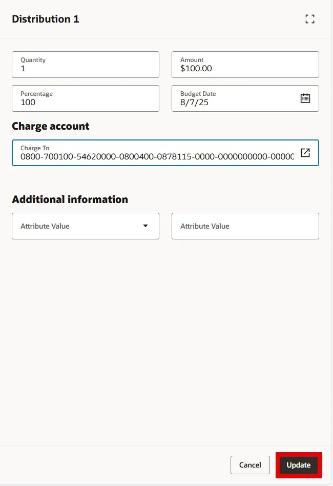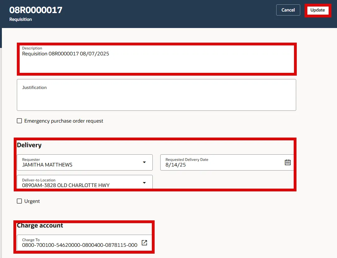 Step 22. Select the Update button to add the Charge account to the SSP Requisition order.