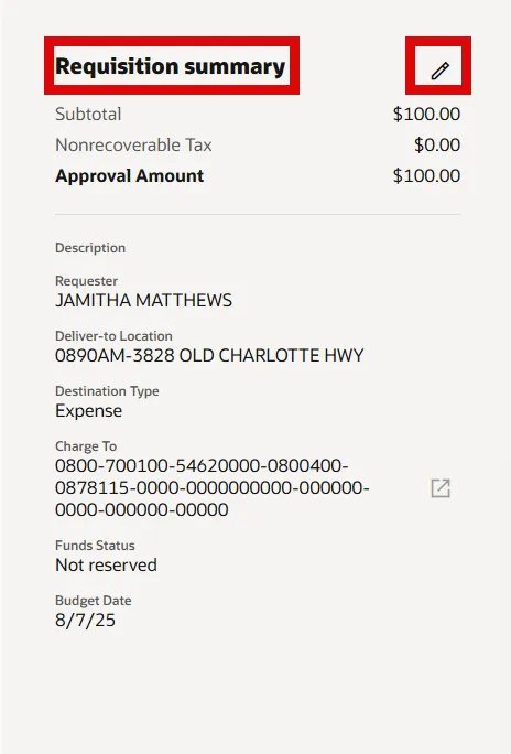 Step 28. You can edit the Requestor, Requested Delivery Date, Deliver to Location, and Charge Account by selecting the Pencil icon next to the Requisition Summary.