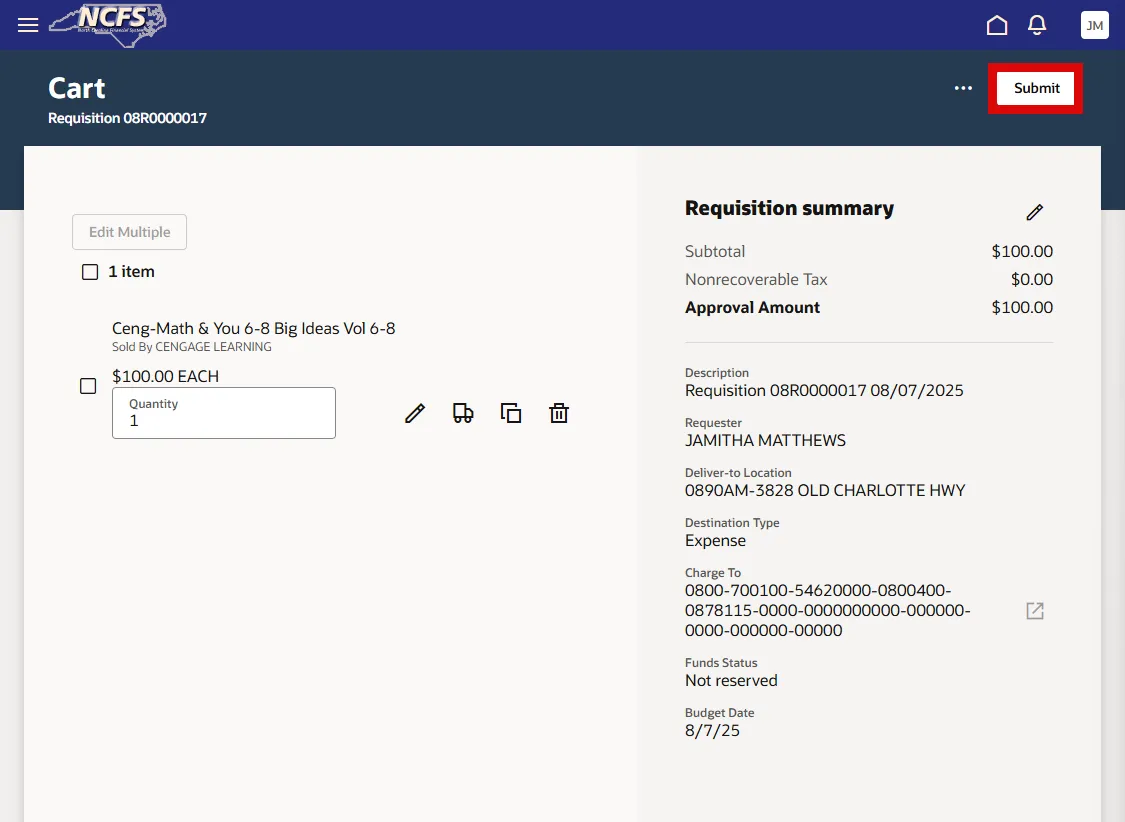 Step 24. In the Cart section, verify all Requisition Order details prior to submitting.