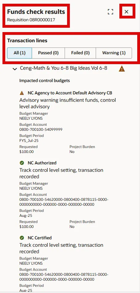 Step 33. Review the Transaction Line Status and discuss with DPI’s Budget Analyst. Select the X to exit.